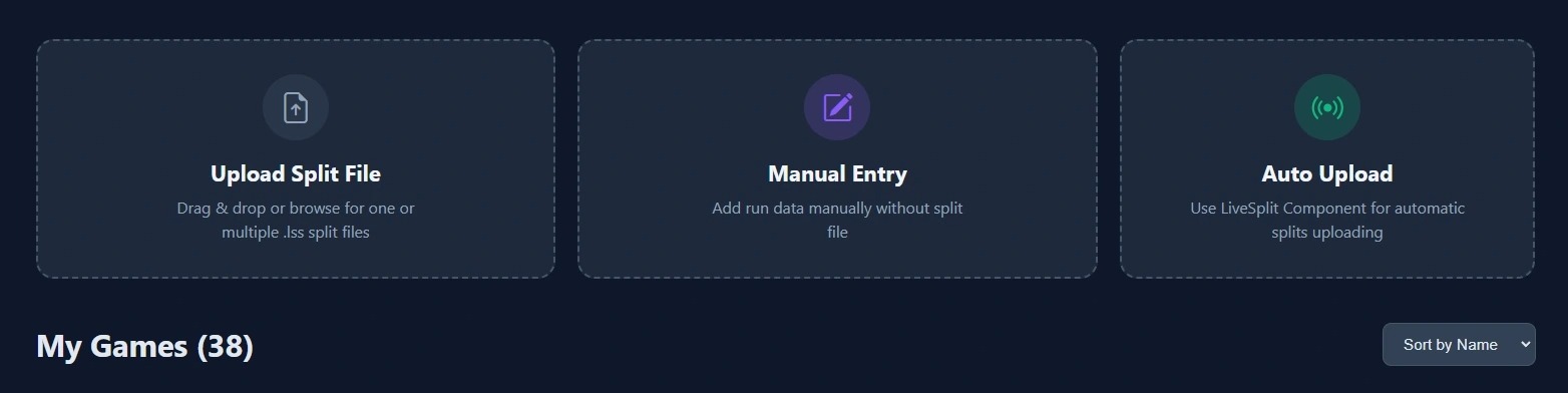 Upload Files: Manually upload LiveSplit (.lss) files (individually or in bulk) or use the LiveSplit component for automatic synchronization. Manual Entry: If no file is available (e.g., when using an in-game timer), you can create a record manually by entering the data yourself.